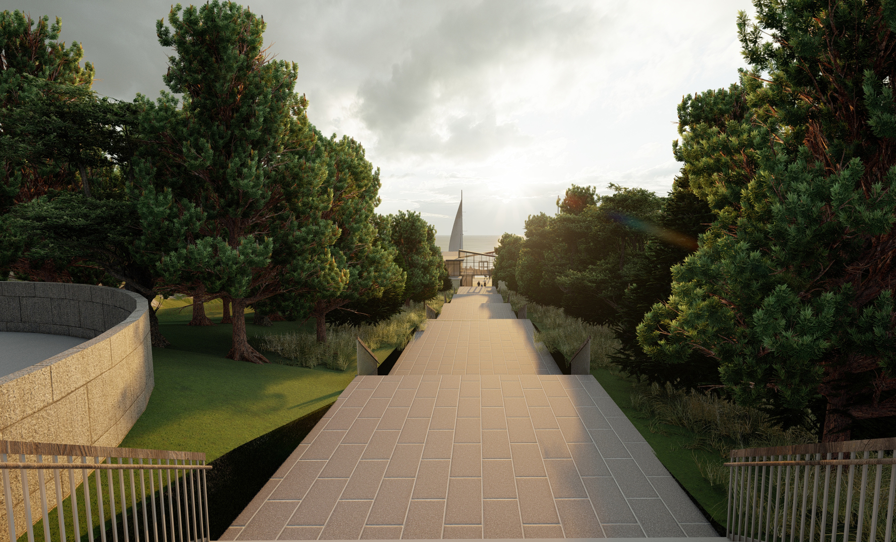 The other idea I focused on is privacy and views. All walls that are facing the street and touching properties are solid walls, while walls facing inward and towards the lake are glass or filled with windows. The views are also hidden has the street level parking is surrounded by trees and shrubbery which makes it impossible to see the view from the street. As you walk down the staircase to the main buildings you get a framed view which will highlight the lake.