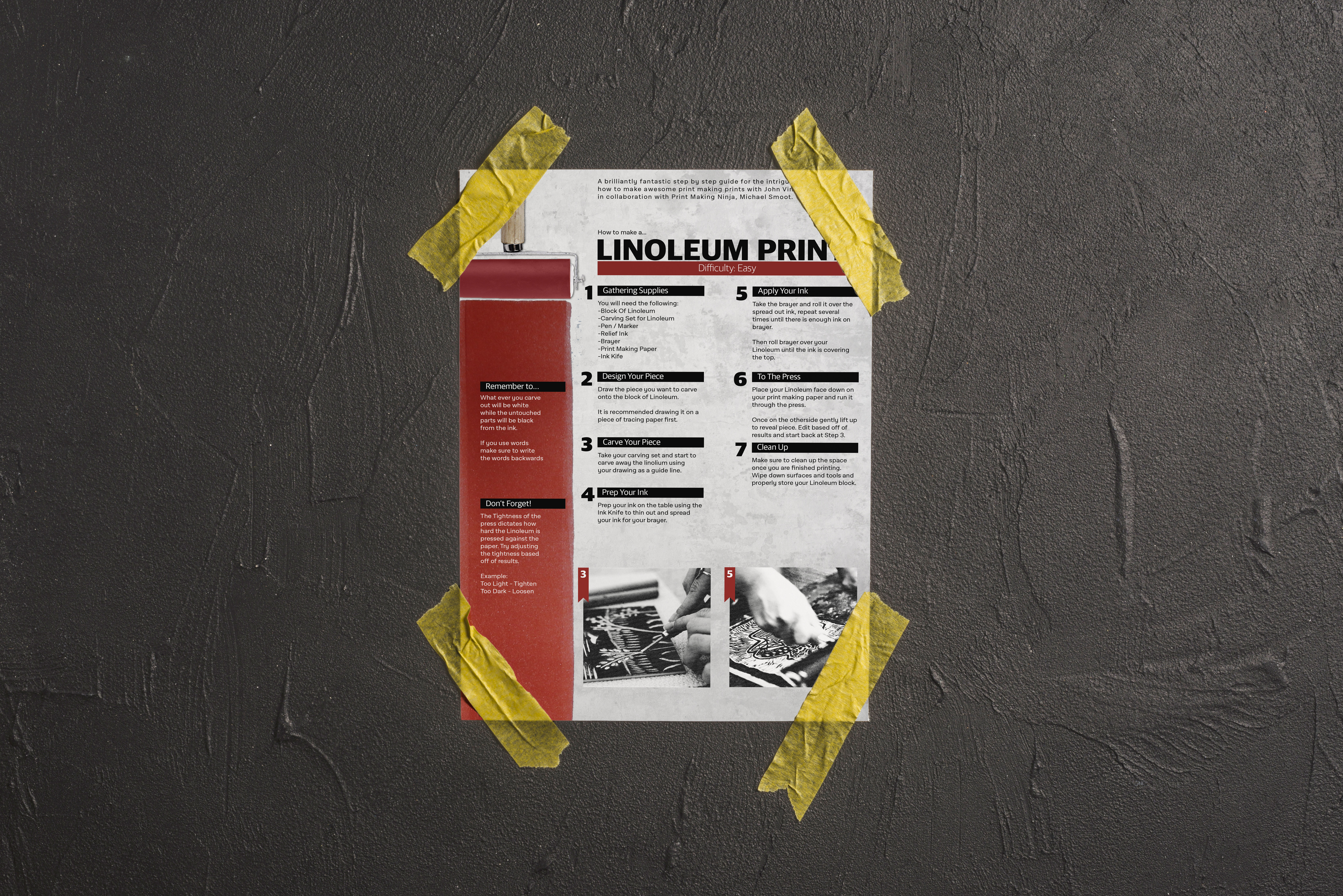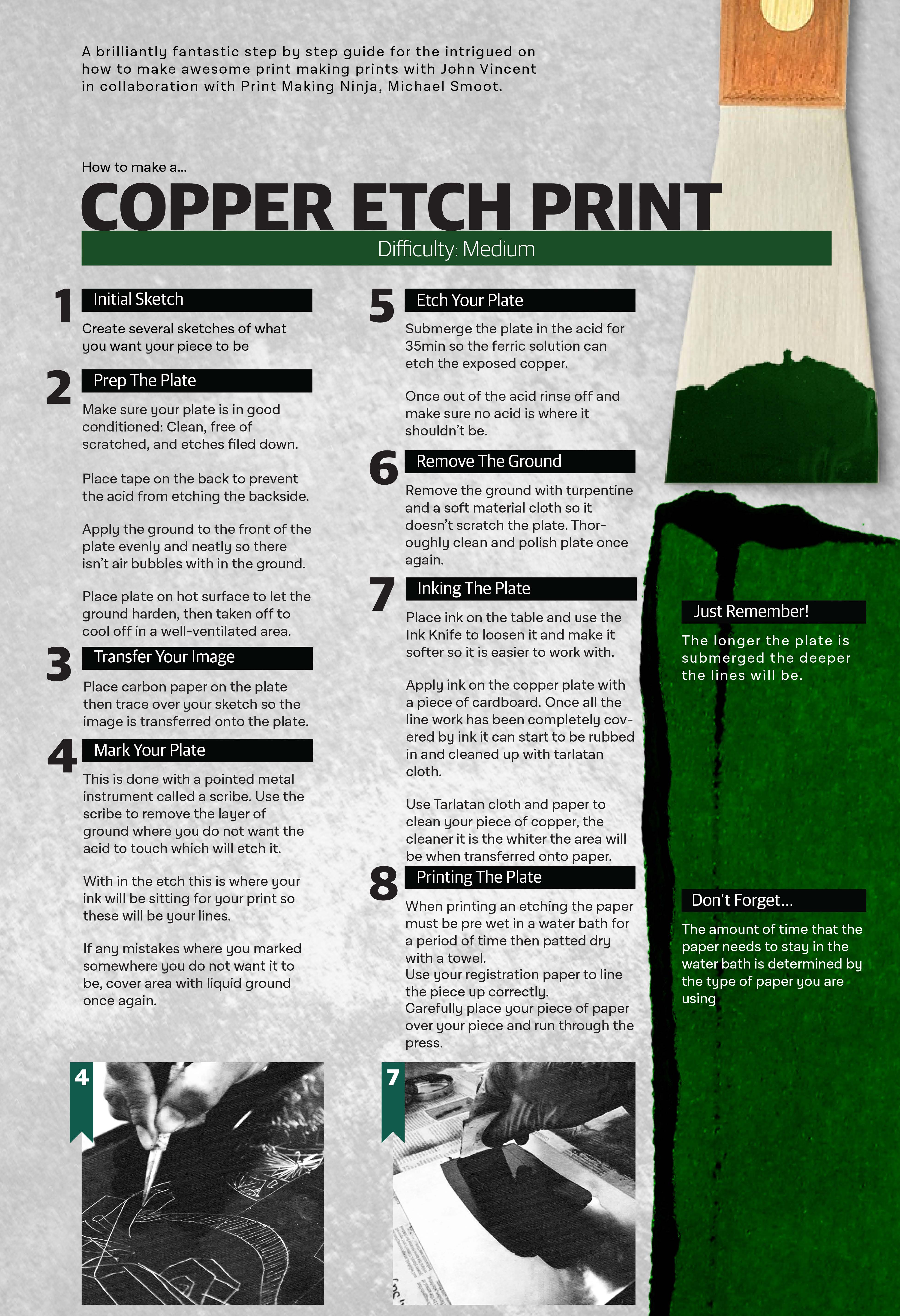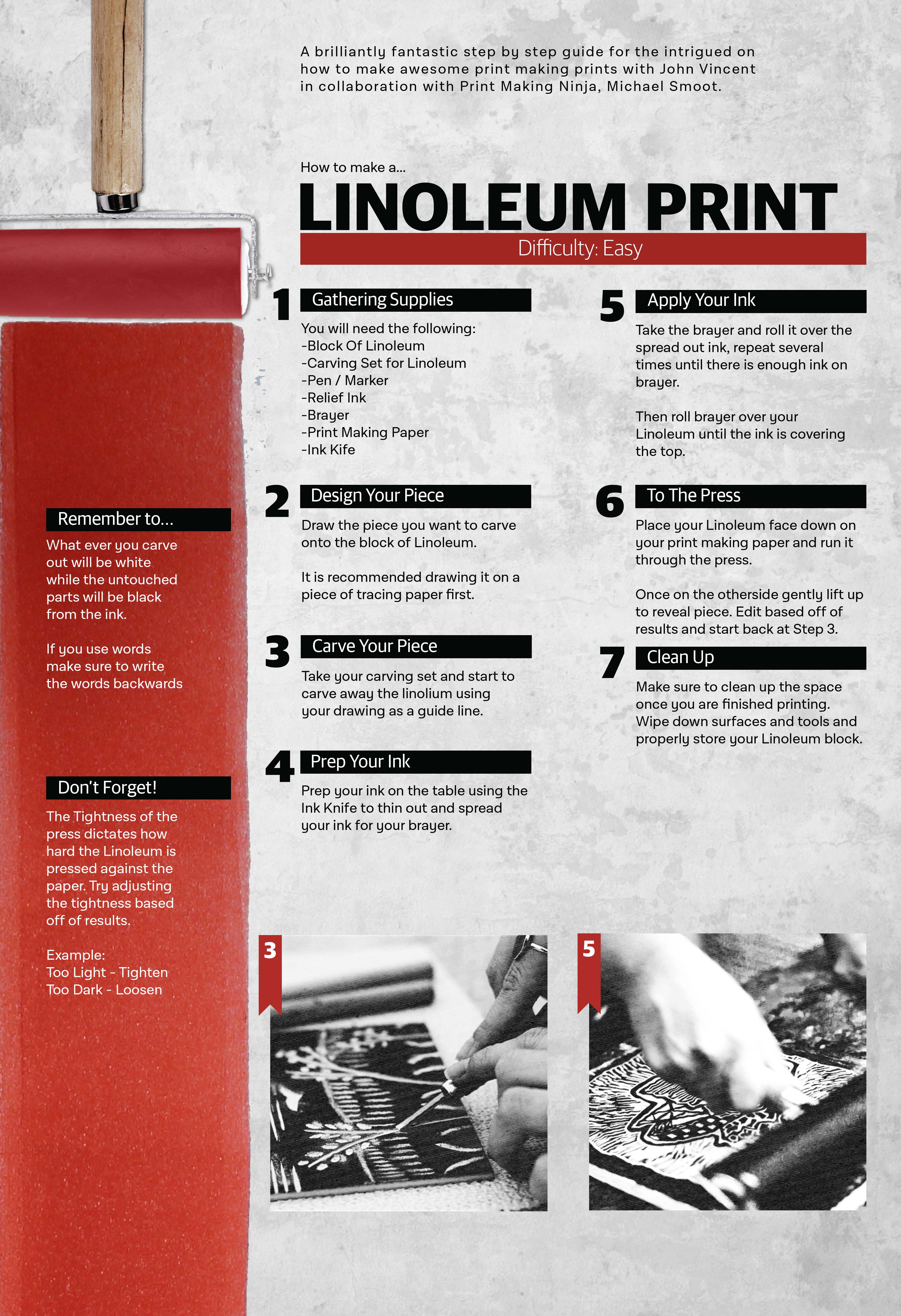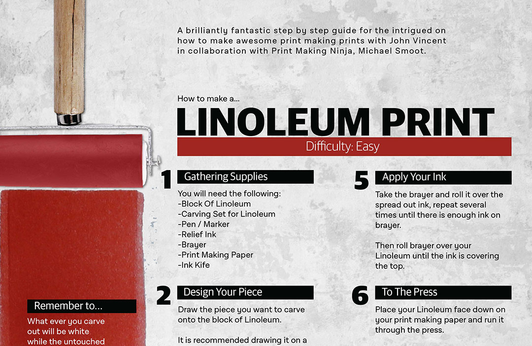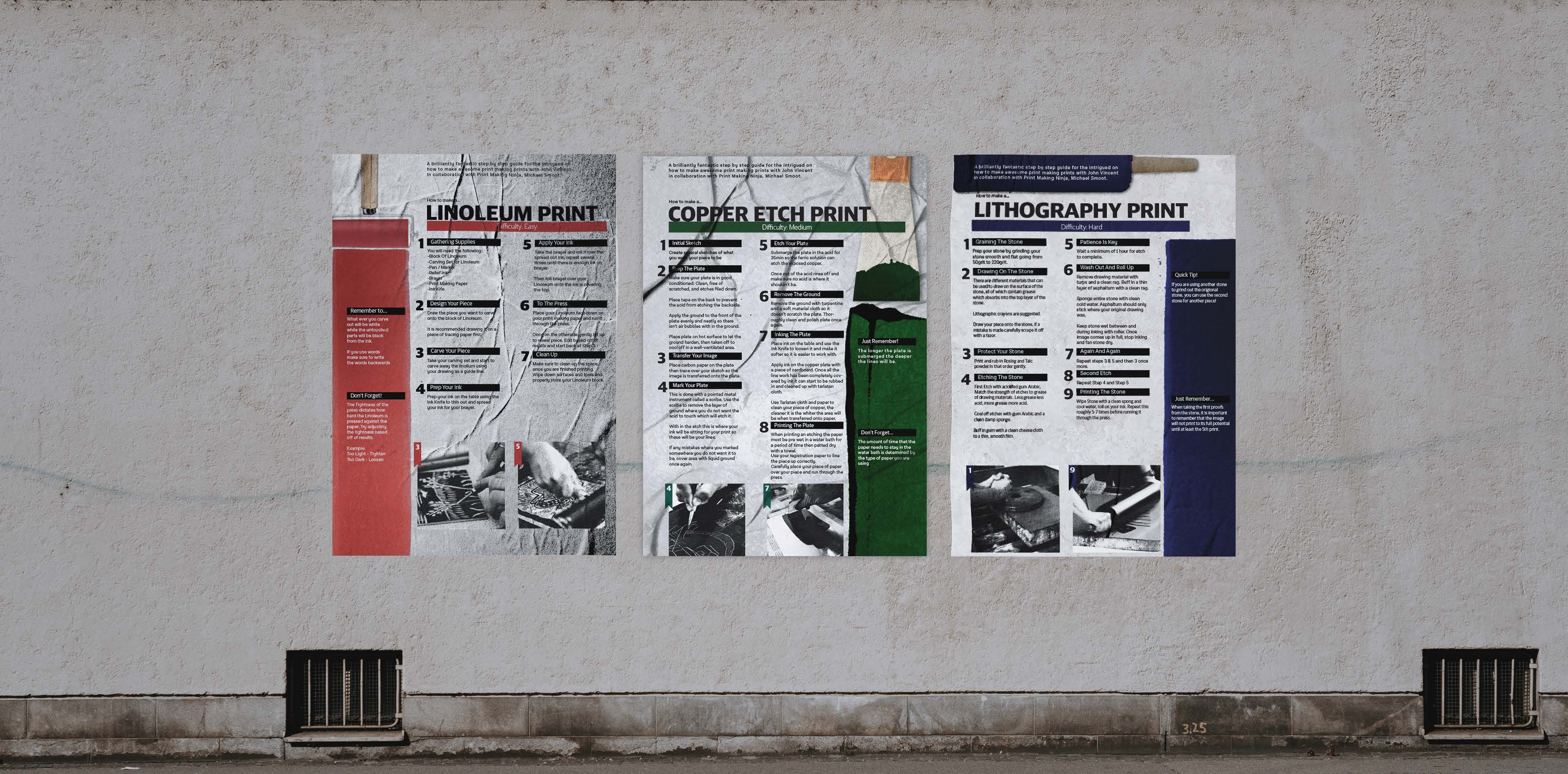There are also several different methods of print making, each one becoming more difficult then the other. In order to help those starting out I created infographic posters of the three most common way of print making, Linoleum, Copper Etch, and Lithography.